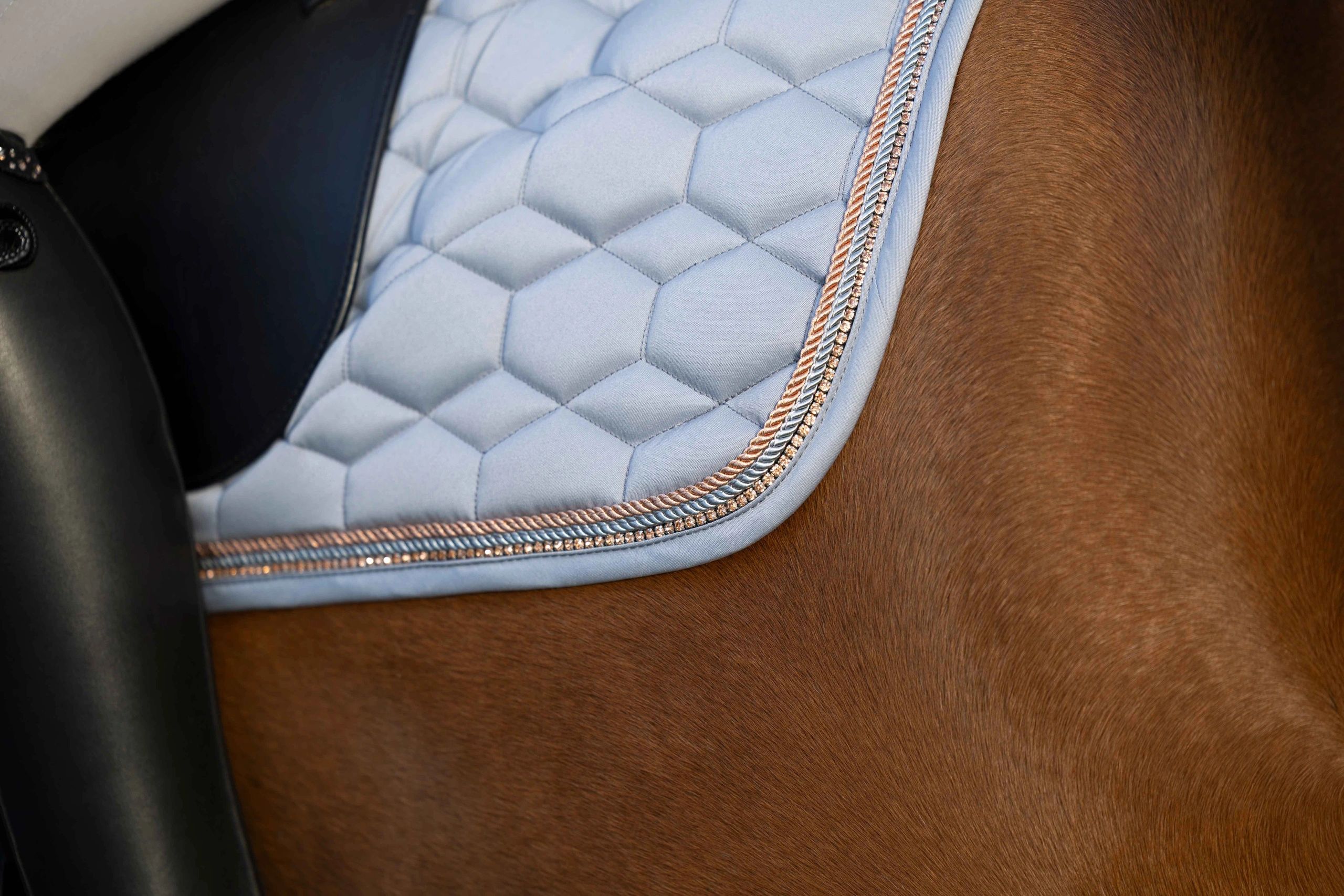 The saddle cloth Rosegold Glamour Style combines functionality with luxury. The underside is made of a functional knitted fabric that ensures rapid moisture transport so that the horse remains pleasantly dry even during intensive training sessions. Thanks to practical loops with Velcro fasteners, the saddle cloth can be put on securely and comfortably, while the foam and wadding filling guarantees soft padding and ideal pressure distribution. The edge of the saddle cloth features two fashionable decorative cords and a trim of sparkling rhinestones, while the fashionable quilting rounds off the design in style. A matching ear