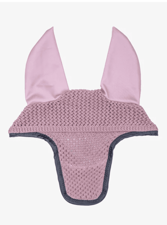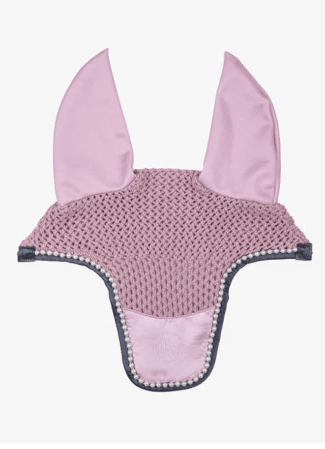 Hand-knitted crochet ear bonnet with a satin flap matching the saddle pad, pearl trim,
